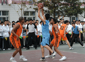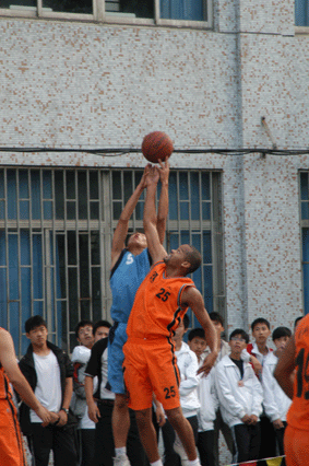 10月24日下午,在我校篮球场上一场精彩的比赛吸引了许多师生驻足观看,两个身材高大的老外更是显眼。这是马陆荣创公司篮球队与我校师生联队进行的一场友谊比赛。
