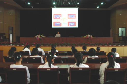 5月24日下午,我校06级全体女生约250人左右在多媒体中心听取了由区计生委蔡佩佩老师主讲的的青春期健康教育专题讲座。蔡老师用丰富的专业知识、通俗易懂的语言向女生们介绍了青春期保健的相关内容,包括青春期的特点、生殖解剖生理、女生青春期生理保健、早恋早婚婚前性行为的危害、少女自我保护应做到的八忌等。由于很多内容与同学们现实生活中的自我保健息息相关,同学们听的非常认真。