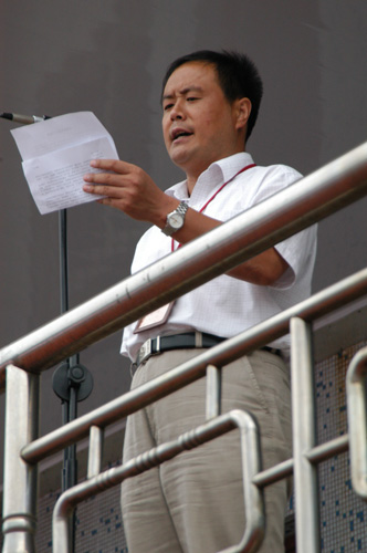 高康校长在升旗仪式上发表了热情洋溢的新学年致辞。他首先代表学校党政班子向新教师和新同学表示热烈欢迎,向全校教职工和同学们致以最诚挚的问候。他希望全校师生再抓机遇,乘势而上,努力实现“创建上海市课改特色学校、争创上海市文明单位、争创国家级示范中职校”新学年三大任务。要积极试行ISO9000学校质量管理体系,构建和谐校园,不断积淀丰厚的校园文化。他要求全校教职工要戒骄戒躁、加强学习、团结奋进,力争做为广大学生喜爱的优秀教师,成为一心为学生服务的优秀员工;全体同学要热爱学校、关爱自己、把握机遇、认真学习,做一名优秀的大众工业学校学生。