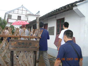 在细雨蒙蒙中,师生一行36人乘坐大巴士来到第一站华亭毛桥村,导游小姐带领我们在乡村的小路上边走边看。以往泥泞不堪的道路被整洁的水泥路取代了,家家户户雪白的墙壁,整齐而干净的园子,精心修整的绿化角,统一而有序的垃圾箱、信报箱给师生们留下了深刻的印象。在知青小屋、农具屋里更是让同学们仿佛回到了二十世纪。曾经是下乡知青的陶老师,在知青小屋里更是感慨万千。短短45分钟的游程,师生们对社会主义新农村有了一个新的了解。