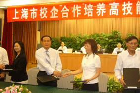 2007年5月22日,上海市校企合作培养高技能人才工作推进会在市政府会议厅隆重召开。在这次会议上我校作为上海市仅有的5所中职校之一,被授予“高级技工学校”称号,并与上海市天灵开关厂签订了校企合作协议,成为上海市首批校企合作培养高技能人才的试点单位。根据协议,学生培养方向为电气运行与控制专业预备高级工(中级工)人才。经过天灵厂与学校的严格面试筛选,共有18名同学成为全新校企合作模式下的第一批学员。