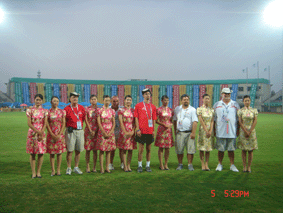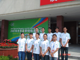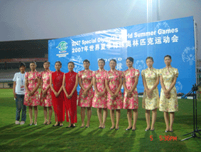 10月4日至11日,2007年世界夏季特殊奥林匹克运动会滚球比赛在嘉定体育中心举行。来自60个国家的314名特奥运动员将参加为期7天的滚球比赛。我校学生礼仪队的12名学生担任了本次比赛的颁奖任务。由于本次的颁奖任务非常艰巨,不同于以往礼仪队所经历的任何一次的颁奖,为了保证圆满完成任务,从9月份开学的第一天开始,礼仪队的同学们就投入了紧张的训练。从站姿、坐姿、仪态、微笑、礼仪接待知识、化妆知识等都是开学第一周内队员们要学习的内容。接下去,每周三到四次分岗位进行训练,并且到嘉定体育场、体育馆实地训练。在看似简单的训练中,许多细节的问题在这一遍又一遍的练习过程中被发现、解决;许多可能会发生的问题,也是在这一次又一次的训练中被想到,应对的方案随即产生。颁奖组数多,就滚球项目达到了91组,这是特奥颁奖的特点之一。每次颁奖最少的有14组,最多有36组,为时2个半小时,这也是对礼仪队的学生的一次耐力考验,因此在训练中,同学们在烈日下一练就是两个小时也是常有的事,穿着从小到大都没穿过的高跟鞋,脚皮磨破了,但同学们咬着牙坚持训练,全然没有了女孩子的娇气。带队的朱老师要求同学们认真地对待每一次的训练,要求每名队员把自己在各类形式颁奖中的任务、位置熟记在心,才能在正式颁奖时不出错、不慌乱。