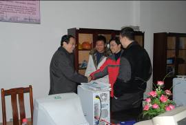 当大家走到信息技术实训中心时,俞书记信步走进教师办公室,亲切地与几位教师握手交流,询问老师的工作、收入、住房等情况,勉励大家努力工作。