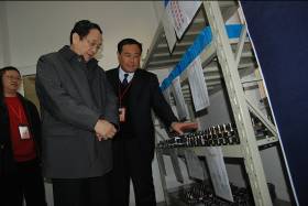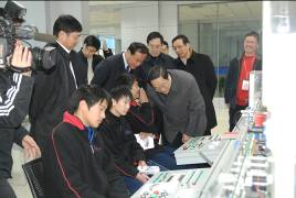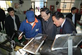 在参观柔性生产系统实训室时,俞书记亲切地与正在实训的同学进行交谈,询问学生交学费的情况、在校就餐情况、父母的收入、自己的学习情况,还不时地考问学生实训有关知识。当听到学生准确流利的回答时,他满意地微笑起来。