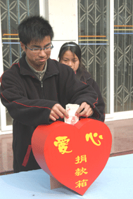 在我们伟大的祖国繁荣富强,人民群众的生活水平稳步提高同时,我们的身边仍有许多因病因灾或因其他原因而陷入困境的弱势群体,渴望我们以血浓于水的爱心与真诚,为他们减轻和消除不幸与痛苦。“爱在大众 共创和谐”——“蓝天下的至爱”慈善募捐活动的倡议书一经校团委发出,立即得到了全校学生的大力响应。1月10日中午,在学校的主干道上举行了捐赠仪式,各教学部的学生会干部把本教学部的捐款投到了爱心捐款箱里。据统计,此次活动共募集到了学生捐款6,344.1元,捐款明细表已在学校公告栏里公布,全部捐款将由学校统一交到嘉定菊园新区管委会。