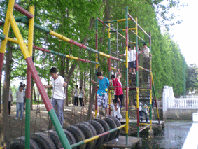十几分钟的路很快就到了,到训练营里大家看到那些训练设施都很好奇,都想去试试。虽然有点难度,但没有难倒我们这些东北的小伙子们。试过之后,我在心里问自己,如果是军训,每天都重复去做,我们还能行吗?还好是玩玩而已······