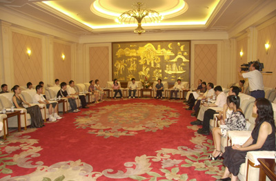 座谈会由市政府副秘书长翁铁慧主持,市委副书记殷一璀等市领导与部分获奖选手和指导教师进行了交流,并与获得大赛一等奖的选手和指导指导教师进行合影。