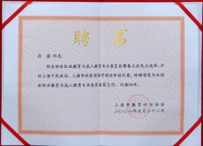 在2008年7月中旬在华东师范大学校长培训中心举行的上海市教育评估协会职业教育与成人教育专业委员会成立大会上,华体会体育被评为“上海市教育评估协会职业教育与成人教育专业委员会副主任单位”,任期四年。同时高康校长经大会民主选举,并经上海市民政局、社团管理局批准,被聘请为专业委员会副主任,任期四年。