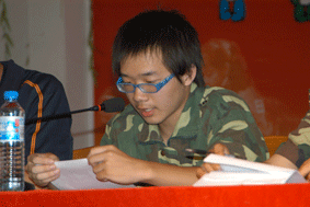 08机电专业的同学代表军训学生发了言,他保证遵守军训纪律,不怕苦,不怕累,克服困难,珍惜军训生活,做到“流血流汗不流泪,掉皮掉肉不掉队”。