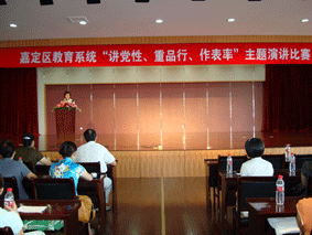 根据嘉定区教育局党委《关于在教育系统直属单位党员干部中开展“讲党性、重品行、作表率”主题教育活动的实施意见》,大众工业学校党总支积极组织党员参加此项活动,8月26日下午,在区教育局C-605会议室举行了“讲党性、重品行、作表率”主题演讲比赛。区教育局党委副书记朱灵,党委委员赵国兴,局党建研究会副会长瞿大我,区语委办副主任辛敏出席活动并担任评委。