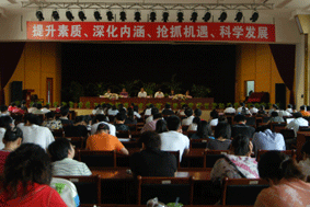 随后,高康校长向全体教职工做了新学期开学动员报告。他指出:新学期学校工作思路是“提升素质,充实内涵,抢抓机遇,科学发展”。在新的历史条件和发展形势下,学校要进一步开展集培训、竞赛、展示为一体的教师全员培训活动,不断提升教师的素质;要大力开展校园文化建设,把学校建设成师生的精神家园和学习工作的乐园;要审时度势,牢牢抓住中职教育发展的大好时机,有前瞻性的、用可持续性的眼光来制订学校的发展规划,使学校走科学发展的道路。他希望全校教职工在新学期里以规范、奉献、创新的精神,为创建市级文明单位(和谐校园)和国家示范性中职校而努力工作,为创建品牌学校而不懈奋斗!