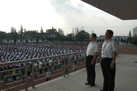 在高康校长的陪同下,张书记视察了学校的教学楼、实训中心、在建的风雨操场等项目,看望了教职工和来自都江堰的同学。高校长向领导详细汇报了学校的开学准备工作和开学第一天的教育教学情况。下午3点50分,正逢学校在大操场举行新学期第一次降旗仪式。张书记走上主席台,一同参加了降旗仪式。