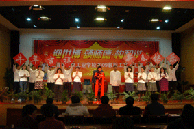 “咚咚……咚咚咚……”阵阵锣鼓声敲来了新年的喜庆,机电部的老师们为大家带来的降州大鼓《龙腾虎跃迎新年》,展现出黄河滚滚不屈的性格和泰山巍峨挺拔的骨骼,让人热血沸腾,激情难抑。高明副校长在这个欢庆的日子里为大家送上了一曲《花儿为什么这样红》,美妙的歌声在会场中蔓延,大家都拍手叫好。接着一直为我校默默奉献的后勤小组唱了一首《东方之珠》。计算机教学部的女教工有如伴着温柔的春风,随着浠沥的小雨迈着妙曼舞姿的傣家小姐妹,款款向我们走来;数控教学部的青年教师们有伴着《春之声》圆舞曲美妙的旋律,迈着轻盈的步伐跳起了交谊舞;教工民乐队的老师们大显身手,演奏了《回娘家》、《八月十五桂花香》等曲目。张卫国老师在综合教学部老师们的伴舞下演唱了一首《恭喜发财》,向观众抛出了新年的糖果和祝福,顿时把场上的气氛又推向了一个高潮……。独唱、小组唱、诗朗诵、舞蹈等节目也精彩纷呈。最后校领导和全体演出人员合影留念。