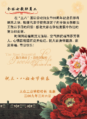 高康校长在校园网上为女教工为发来了节日贺卡,学校电子屏也打出了祝贺“三八”节的标语,在最美的日子里送来了最佳的祝福。