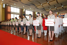 志愿者的名单一经确定,团委就按照岗位要求进行分组,随后在相关负责老师的带领下,进行了紧张而有序的训练。开幕式的前两个星期中,在校园中经常可以看到志愿者训练的身影。他们在指导老师的带领下,一遍又一遍的熟悉赛场地点、熟悉路线;为了能整齐划一的举好牌子,老师们更是以奥运会礼仪小姐的举牌手势来训练志愿者;为了训练挺拔的站姿,一动不动一站就是半个多小时,在上星期四的彩排中,主会场的学生观众配合彩排训练了3个多小时,0801班全体女生以及数控教学部的部分女生,穿着高跟鞋,也硬是坚持了下来,尽管很累,脚很痛,但是却没有一个同学提出来说要退出。