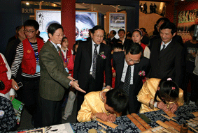 参展的教育机构和院校纷纷拿出浑身解数向观众们展示各自的教育成果,有的让初中生穿上京剧戏服、小学生写书法和表演江南丝竹,以此体现他们在民族文化教育方面的特色,还有的同学现场表演竹刻艺术。
