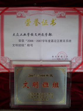 会上朱主席还宣布了我校文科教学部荣获上海市嘉定区文明办和总工会颁发的“2006—2007学年嘉定区教育系统文明班组”称号,数控办学部获得的上海市嘉定区总工会颁发的“工人先锋号”称号。