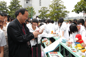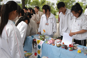 上午8:00,天空还飘着零星小雨,劳动周和心理社团的同学们在老师的指挥下在义卖现场清扫场地,搬置台阶,总务后勤为义卖现场周围挂起了宣传横幅,竖起了活动背景。在一阵忙碌后,上午10点左右,以班级为单位共38个商铺的展台台阶在篮球场周围排开,同学们把捐赠出来的物品一一陈列,并精心布置商铺。学生书画社团、陶艺社团的同学们也把制作精巧的作品拿出来义卖。到了中午,天公也作美,阴沉了一个上午的天空居然露出了太阳的脸。和风艳阳,让我们不仅看到了夏的脚步,更感受了付出爱心的温暖和幸福。12:00,随着歌曲《爱的奉献》缓缓响起,义卖现场聚集了越来越多的师生。各商铺的叫卖声此起彼伏,“促销员”们使出了浑身解数吸引师生的注意。看到有停留的脚步,“促销员”就会热情相迎,为顾客介绍商品;看到顾客有购买意向,同学们更是老练地与之讨价还价,在一声“好!成交”声中,一笔买卖做成了,顾客捧着心爱之物满意而归。08烹饪班的摊位前人头攒动,原来这里香喷喷的、新鲜出炉的点心、菜点吸引了不少老师的目光。陶艺社、书画社的摊位前,师生们被那些制作精美的T恤、鞋子、陶艺作品所吸引。在义卖中,老师们纷纷慷慨解囊,成了促销员们的“主攻目标”。围绕义卖现场一圈下来,淘到商品的师生们脸上洋溢着满足的笑容,然后拿起笔在活动背景布上签下了自己的姓名。