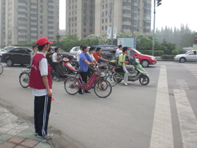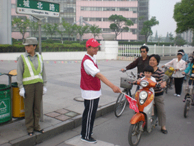 早晚高峰时段的城北路、环城路交叉口是一个十分繁忙的路口,人流量和车流量都很大,一旦行人车辆违反交通规则,就会造成交通混乱,甚至会引发交通事故。6月1清晨7点,志愿者们正式上岗了。在此之后的一个月中,每天他们都要准时地来到城北路、环城路交叉口,身穿“带文明出行、携平安回家”字样的红色志愿者背心,认真地挥舞着手中“文明在心,快乐随行”的小旗,全神贯注,挥旗摆臂,劝阻违规行为,指引文明行路。学生们有时候为询问者指路答疑;有时候用哨子纠正不按规定行走的群众,并面带笑容地劝导这些行人自觉遵守交通法规。路口红灯亮起,学生上前一步、横出手中的小旗;绿灯亮起,他们后退一步侧身,把小旗换到另一只手中指向前方,行人井然有序地朝马路对面走去。一个绿灯,数以百计的上班族和市民从路口四面涌出,一到红灯亮起,大多数人自觉停住脚步。偶尔有人想“突围”,同学们们只需挥一挥小旗,市民就会明白这一无声语言,赶紧收回跨出去的脚步。