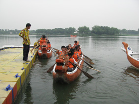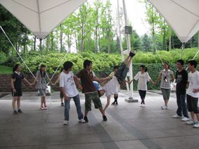 6月29日上午10点左右,营地教官热情地迎接着我们的到来。在教官的介绍及安排下,同学们分别住进了具有欧洲风情的宿舍楼。两天的活动营地安排的非常丰富,有考验团队合作的素质拓展项目;有休闲放松的划龙舟;有走趣桥、勇敢者道路等等。由于两天正逢江南地区的黄梅雨季,天空阴晴不定,同学们时而在雨中,时而在烈日下穿梭于东方绿舟的各个活动场地。在为学生设计的活动中,比较注重以小组单位,团队合作。同学们在齐心协力完成活动过程中,付出了努力,收获了成功,在每个活动项目结束后,教官还让同学们谈心得体会,分析成功或者失败的原因。