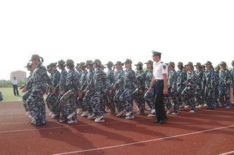 经过了两天的烈日炙烤,今天天气来了个180度的转变。天阴沉沉的,时不时的还飘着小雨,而且风很大,虽然学生穿着较后的军装,但是还是有不少学生因为不能适应天气的急剧变化而感到身体的不适应。绝大部分同学还是能咬牙在寒风细雨中刻苦训练。