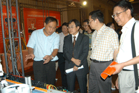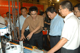 沈晓明、翁铁慧等与会领导还详细观摩了八个参赛队的现场展示,并与各参赛学校的师生亲切握手、交谈,鼓励大家再创佳绩 。现场展台和展示,美不胜收。当沈晓明副市长看到“机电一体化设备组装与调试”的展示时:称这个项目非常有技术含量,设备非常精细,我校参赛师生也以熟练的技术动作和快速的编程能力给在场的每一个领导和观众展现了比赛中的风采。