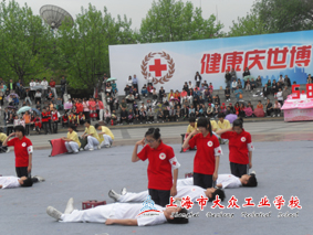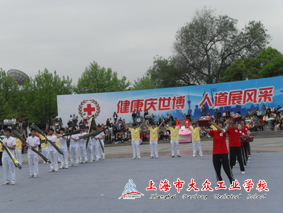 2010年5月8日是第63个世界红十字日,区红十字会、区教育局携手各委办局于博乐广场举行了活动主题为“携手人道参与世博”的大型纪念活动,中共嘉定区委副书记曹一丁、上海市红十字会副会长李明磊以及各委办局领导出席了本次活动。博乐广场上人头攒动,气氛热烈。我校0914班21位男生、09幼保班18位女生经过一个月的刻苦训练,成功表演了一档团体操与急救技能相结合的红十字节目,同学们在汗水付出之后,也收获了喜悦。