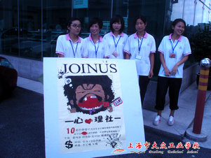 心理社老成员们早早的来到学校,每个成员身上都穿着亲手彩绘的心理社T恤,亲自出马,在我们的校园里,发放精心准备的宣传心晴部落格心理社卡片,引来了好多同学的好奇,同学们纷纷很热情的来询问。心理社成员脸上充满了微笑,给新生留下了深刻的印象!这样的方式一直持续了有好多天,使得宣传效果大大的提高!