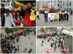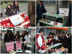 在活动现场里,每一个铺位都拥有自己的名称。色彩各异的海报设计也为此次活动增光添彩。义卖活动中,每个摊位的学生各自施绝招,有的“推销员”积极叫卖,甚至还“出门”宣传,在学生们琳琅满目的商品前,一批又一批的老师和学生被吸引前来观看与购买,硕大的篮球场里人头攒动,有的铺位甚至被围得水泄不通。如此火爆的场面乐坏了叫卖的“推销员”,有的摊位一下子增加了多名工作人员来招揽“顾客”。而“收银员”和“登记员”忙得不可开交,短短一个小时的义卖里,他们几乎就没有休息的时间,如此异常的“生意”,给了他们额外的动力与活力。在不到一个小时,很多义卖品被抢购一空,不少商铺不得不提前关门,真可谓“爱心涌动冬季校园,赤子情满大众工业”。