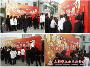 义卖活动伴随着歌声中拉开帷幕。各班学生认真布置摊位,合理评估义卖品的价格,贴上价格标签,为整个活动制造良好的气氛作好准备。义卖时对购买人和每件物品的出售情况做好记录,填写《爱心义卖销售清单》,做到透明、公开。在活动现场,一块巨大的签名板激发起了学生们对爱的呼唤,到场的学生们踊跃地签名,决心用自己的实际行动许下这同一片场地中共同的祝愿。