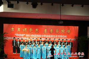 最后上场的是来自大众工业学校的学生们。历经千辛万苦,流过不少汗水,工业学校的铁血青年们为到场的领导、评委以及观众们送来了梁启超的《少年中国说》。从互不相识至现在的配合默契,一个多月的磨砺与苦练让他们真正地融入了少年中国说里。要让祖国成为繁荣富强的少年之国,只有从自身做起,从少年做起,将自己所学的职业技能更好地为社会服务。“红日初升,其道大光;河出伏流,一泻汪洋;潜龙腾渊,鳞爪飞扬;乳虎啸谷,百兽震惶”呐喊出了青年们对自己与国家未来的祝愿;“美哉我少年中国,与天不老;壮哉我中国少年,与国无疆!”更是博得了不停掌声,还甚至有不少观众也随之朗读起来。