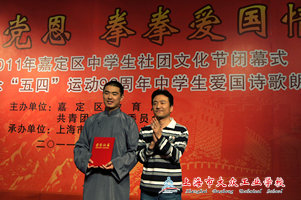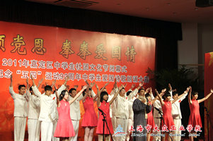 五四青年节,是为纪念1919年5月4日爆发的五四运动而设立的。它来源于中国1919年反帝爱国的“五四运动”。而92年后的2011年,嘉定区中学生们也欢聚一堂,庆祝自己的节日。嘉定区教育局团工委也在社团文化节闭幕式到来之际举办纪念五四运动九十二周年中学生爱国诗歌朗诵大赛。在主持人激情嘹亮的话语中,闭幕式也正式拉开了帷幕。