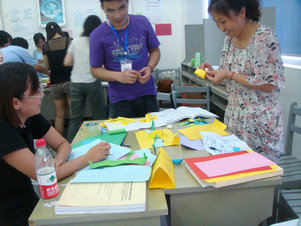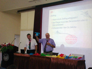 培训的第二天大家集聚逸夫楼报告厅,承办方以“制作飞机”为任务线索将教学推向高潮。每个大组通过手机上网查找制作飞机的方法、小组讨论、计划与决策等方法尽可能发挥自己的创意制作纸制飞机;接着就是PK环节,6大组进入比赛环节,由6位专家做裁判检查评估,最终评出优秀团队。通过这个活动让学员们在“做中学”中初步领会完整行为导向模型的雏形,即“资讯”、“计划”、“决策”、“实施”、“检查”和“评价”六个阶段,达到抛砖引玉的作用。