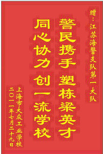 学校领导为江苏省海警部队的官兵们送上“军民携手塑栋梁英才,同心协力创一流学校”的锦旗,宾主双方领导互相祝愿部队官兵和学校师生身体健康、事业兴旺、团结和睦、家庭美满,