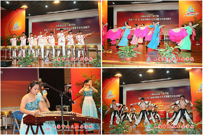 其中乐器带给同学们的震撼也不是能用一语两语能道清说明的。鼓乐表演中清一色的都是男生,大大小小、数量不一的鼓整齐的排列在舞台上,只听一声重击想起,耳边顿时想起澎湃的鼓声,男生们仿佛用全身的精力在敲打,更有时发出吼叫声。鼓声随着他们整齐、有序的敲打,有时鹤立群雄、有时低沉有力。鼓出这曲威惊四座、震撼八方的《威震大众》。
