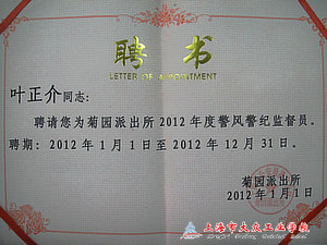 丁健表示,为推行和深化警务公开工作,收集传递社会各界对公安机关和公安工作中存在的问题及意见,更好地维护菊园地区稳定,特邀叶正介老师担任教育系统警风警纪监督员。