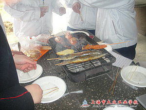 11点左右,欣赏完美丽风景后,早已饥肠辘辘的同学们来到了露营烧烤基地,可以在此大饱口福了。不过,这里不是卖现成的烧烤,也不是用高级的烤具。花30块钱租了个简陋的烤炉,就开始了期待已久的烧烤。