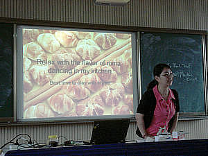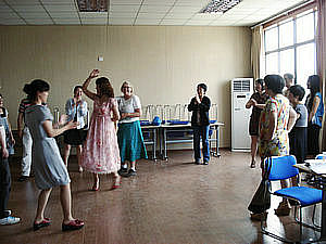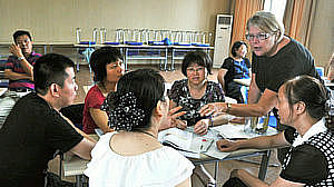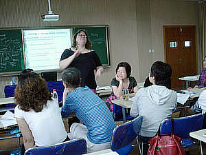 前七天听说课的教师是来自加拿大的Mandy Banks。她到中国为各级各类老师做英语方面的培训已经有九年了,经验相当丰富,课堂掌控能力极强。她语速很快,但能根据学员们的实际情况调整所用词汇和句型。她精力充沛,声音洪亮,每次课一个半小时,她基本没有休息的时候。教室里空调效果很好,但每次课结束,她的头发根都会湿透。Mandy准备的教学内容相当丰富,教学方法相当灵活。在这样的老师的带领下,学员们总能思想高度集中。再加上Mandy的提问面很广,不管学员们表达能力如何,都必须在她的引导下回答她的问题,这就让学员们无形中提高了英语口语能力。所以,尽管听说课只有七天时间,但学员们都普遍感觉听说水平有了明显提高。