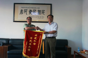最后为感谢江苏浏河海警教官对我校德育工作的大力支持,感谢驻校部队教官对嘉定地方职业教育的帮助,高康校长亲手将“共建和谐、军民鱼水情”的锦旗赠送给姜中大队长,双方共建单位领导人在紧握双手合影留念后将本次的八一共建慰问活动推上高潮。拥军优属、拥政爱民、军民一家亲、军民鱼水情的优良传统,将在本次活动得以延伸和发展,大众工业学校和江苏浏河海警一大队也将朝更高更远的发展目标迈进!