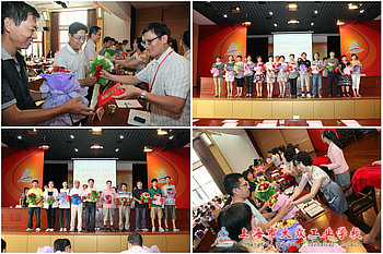 紧接着,陆浩勤副校长宣读了《关于表彰2011-2012学年度优秀教职工的决定》(大众工校【2012】11号文件),表彰各条线工作中做出突出贡献的优秀教职员工,随后,获奖教师分批登台接受颁奖。主席台上,校级领导向受表彰教师一一颁发荣誉证书、并送上精美花束。