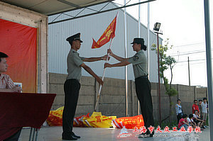 军训动员大会还举行了授旗仪式,承训教官从总指挥手中接过连旗,他们宣誓将以身作则,树立榜样,营造良好氛围,力求圆满完成今年的军训任务。