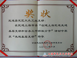 大众工业支部从2007年的达标支部、2009年的嘉定区先进支部到2012年荣获上海市先进基层支部,花开花落整整八个春秋。 2012年10月,我们又迎来了新会员韩莹老师。11月10日,工业支部的新老会员们相聚在一起,庆祝这一刻的到来,此时,再多的言语也道不尽。但是,我们也深知,这一切离不开民进嘉定区委各级领导的关心,离不开大众工业学校党总支的全力支持。 一个基层支部的不断进步与成长,不仅要做好自身建设、立会为公,也要做好本职工作,更重要的是要领会民进区委传达的精神,为学校发展尽到责任。特别是支部全体在职会员为了“学校更好的发展着想,做好做强学校《计算机应用》这个专业的可持续发展,从年初的代表民进嘉定区委前往真新街道创业园区进行社会调研,到下半年的“农民工培训”这一提案从多方面多渠道做了大量调研工作等等,为学校乃至整个嘉定区职业教育的发展作新的设想。 当然,我们也有许多尚需完善之处,但是,在杜天一主任的带领下,我们有信心努力去提升,不断去进取。我们不仅要保持,要使支部具有特色和亮点,更要着眼于未来。相信,会有那么一天,大众工业支部将会再一次地载入新的史册!