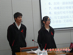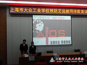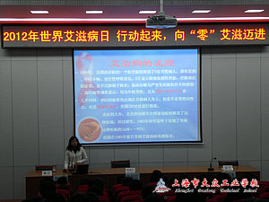 | ——记我校2012“预防艾滋病”同伴教育 本次活动共分为三个模块:知识讲解、小品《吸毒者的自白》、《野火》游戏。主持人1151班沈家骏、顾静燕同学以重新树立每一位学生对于艾滋病了解为基础,——化了解同学们心中的误区,正确纠正了其“艾滋病”的错误观点,耐心解说了艾滋病以血液传播、母婴传播、性传播的三大途径,并说明全球有HIV感染者 4030 万人,全球死于艾滋病的人已达1400万,全球感染艾滋病的成人和儿童将超过3300万,每天新感染者 14000人,并且以其每分钟感染9个人的速度不稳定增长,中国有登记的艾滋病患者人数为42.9万人,其分布地区波及全中国。本次活动中,通过各项课件和症状反应图片,让同学了解了艾滋病的广泛传播性和迅速性,并且让每一位同学重新认识到艾滋病是一种可预防的疾病,以及从同性恋与异性恋的视频中,让我们懂得一味的侮辱与歧视,只能给艾滋病患者带来更大的伤害和痛苦,只能让艾滋病更加猖獗。无知、恐慌与歧视是无法战胜艾滋病的!我们的敌人不是艾滋病患者,而仅仅是艾滋病病毒!面对艾滋病,我们需要打破沉默,消除歧视!他们是我们的兄弟姐妹,他们本来和你我一样,有欢乐生活、有幸福的家庭、有未来的憧憬。但现在他们要遭受艾滋病的折磨,同时还要承受因歧视而来自社会各个方面的压力。小品《艾滋病的自白》由一个艾滋病病人被告上法庭为背景,从中引发一个问题,艾滋病并不可怕,可怕的是人类那颗无知的心,艾滋病可以预防,但是需要人类从自我做起,不去触碰任何有可能传染艾滋病的途径。 “一颗热诚的平常心远比千百倍的付出更被渴望得到”,活动中,主持人反复说明了,预防艾滋病是全社会的责任以及关怀每一位病人,感恩每一个生命的真切含义。人人需要理解,需要关怀。艾滋病感染者和病人更需要理解、关爱和支持!艾滋病患者是人类与艾滋病斗争中最最前沿的战士,让我们给他们以足够的尊重,给他们更多的关爱,给他们生存的勇气,共同创造一个没有侮辱和歧视的世界!相互关爱,共享生命!