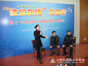 ——嘉定区法宣办、嘉定区广播电台、大众工业学校联合开展“法宝在线”校园行活动 11月6日上午,嘉定区法宣办、嘉定广播电台与华体会体育联手合作,在学校阶梯教室举办了一场别出心裁的法制教育活动——“法宝在线”校园行电台直播。由学生提出一些日常中的法律困惑,由电台法律嘉宾现场解答。以法律视角观察社会,以法律观点评价是非,以生动案例警示人生,从而达到增强学生社会责任意识和法律责任意识的教育目的。 本次“法宝在线”校园行由嘉定人民广播电视台夏语担任主持人,我校法制副校长沈燕忠警官以及嘉定区法律援助站吴小乐律师担任嘉宾。学校100余位学生作为观众出席直播现场。