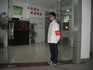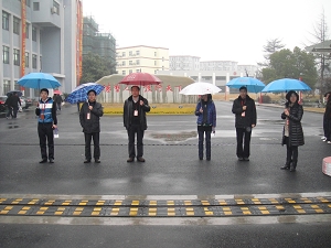 中午进餐期间,校长高康、副校长陆浩勤以及学生处全体工作人员分站在教学楼通往学生食堂的交通要道上,监督就餐队伍的排队情况并维持现场秩序。