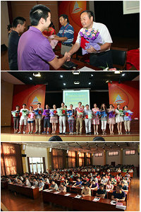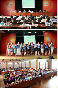 副校长陆浩勤宣读了《关于表彰2012-2013学年度优秀教职工的决定》,教学条线表彰102人、德育条线表彰62人、市场与培训条线表彰2人,随后,获奖教师分17批登台接受颁奖。主席台上,校级领导向受表彰教师一一颁发荣誉证书、送上精美花束,并合影留念,表达一学年来对教职工们辛勤付出的感谢,对收获卓越成绩的嘉奖,以及对卓越贡献的激励。