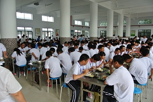中午进餐期间,校长高康、副校长陆浩勤、学生处全体工作人员、驻校教官分站在教学楼通往学生食堂的交通要道上,监督就餐队伍的排队情况并维持现场秩序。绝大多数班级均能按照规定的行进路线,有序进入食堂就餐。