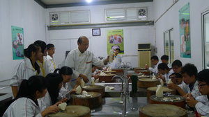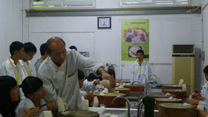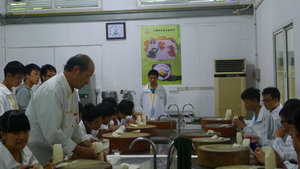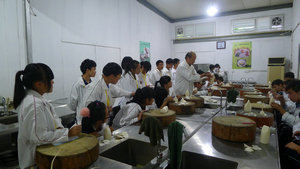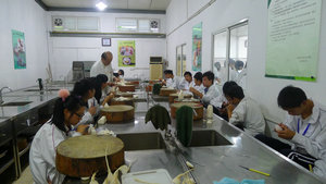社员中更是有着烹饪班2年级的学生,他们总能先老师的教学速度,由于两年来学习的经验,自身的领悟能力和动手能力的培养,出色的完成了作品。当然,社团中也存在经验不足的社员,陈忠林老师在集体示范之后,总是对需要帮助的同学进行一对一的教学。