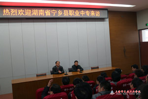 湖南宁乡县职业中专一行80人在华东师大职教师资培训基地工作人员的带领下,来到我校考察学习。针对这批公共课教师的参观需求,学校办公室老师在引导校园参观中过程中,带领一行观摩了“升旗”集队入场、参观学生的社团活动场所、感受学校实训室文化、深入教室体验班级管理,一路解答他们所提出的各种问题。随后,高校长在多媒体教室为一行做讲座,首先简要介绍了学校的办学基本情况,阐述了学校在解决招生难、管理难、就业难问题中,紧紧抓住“育人”这一根本,高度重视学生的管理和教育,着力解决学生的信心问题和行为规范问题、培养学生爱心与耐心的过程。高康校长风趣的语言、生动的案例、精辟的观点引发了会场里的阵阵掌声。
