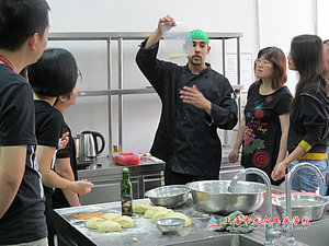 6月27号,教师培训继续进行。今天的培训内容让老师们很兴奋,因为有外国“大厨”手把手教老师们做西点!外国“大厨”名叫Jiame,是瑞恩英语培训中心的资深教师,来自美国,教学经验丰富,教学方法灵活。今天他要通过教授大家做披萨等西点来让老师们掌握西方厨房操作过程中的标准英语表达。培训九点才开始,但是敬业的Jiame老师8点钟就到了我校的烹饪实训中心开始一系列的准备工作。等九点钟教师们到位的时候,Jiame老师已经准备了满满八大盆的食材。九点钟,“大厨”们准时开始工作,经过Jiame老师的细致耐心的讲解和逐一的指示引导,“大厨”们的工作成果逐渐呈现。当一个个色香味俱全的披萨饼出炉的时候,大家的喜悦溢于言表。时间过得很快,一个上午在紧张和惊喜中度过,老师们都感觉受益匪浅,既基本掌握了西点的制作方法,也学到很多专业的厨房英语。大家纷纷表示,希望以后能多开展类似的活动或培训,让大家在轻松和愉悦中学习和进步。